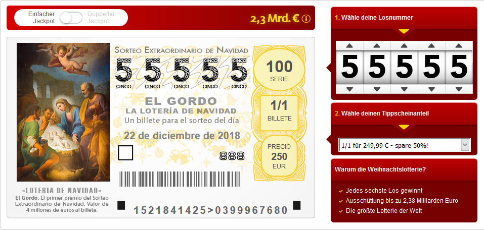 Gesamtgewinne von über 2,3 Milliarden Euro und die extrem hohe Gewinnchance von über 15% je Tipp bzw. Los machen die Spanische Weihnachtslotterie zur größten Lotterie der Welt. Allein in Spanien fiebern über 90% aller Einwohner der Millionenbescherung Jahr für Jahr entgegen. Seid dabei und sichert euch dieses Jahr zu Weihnachten im Lottoland euer Los für den kollektiven Gewinnrausch.