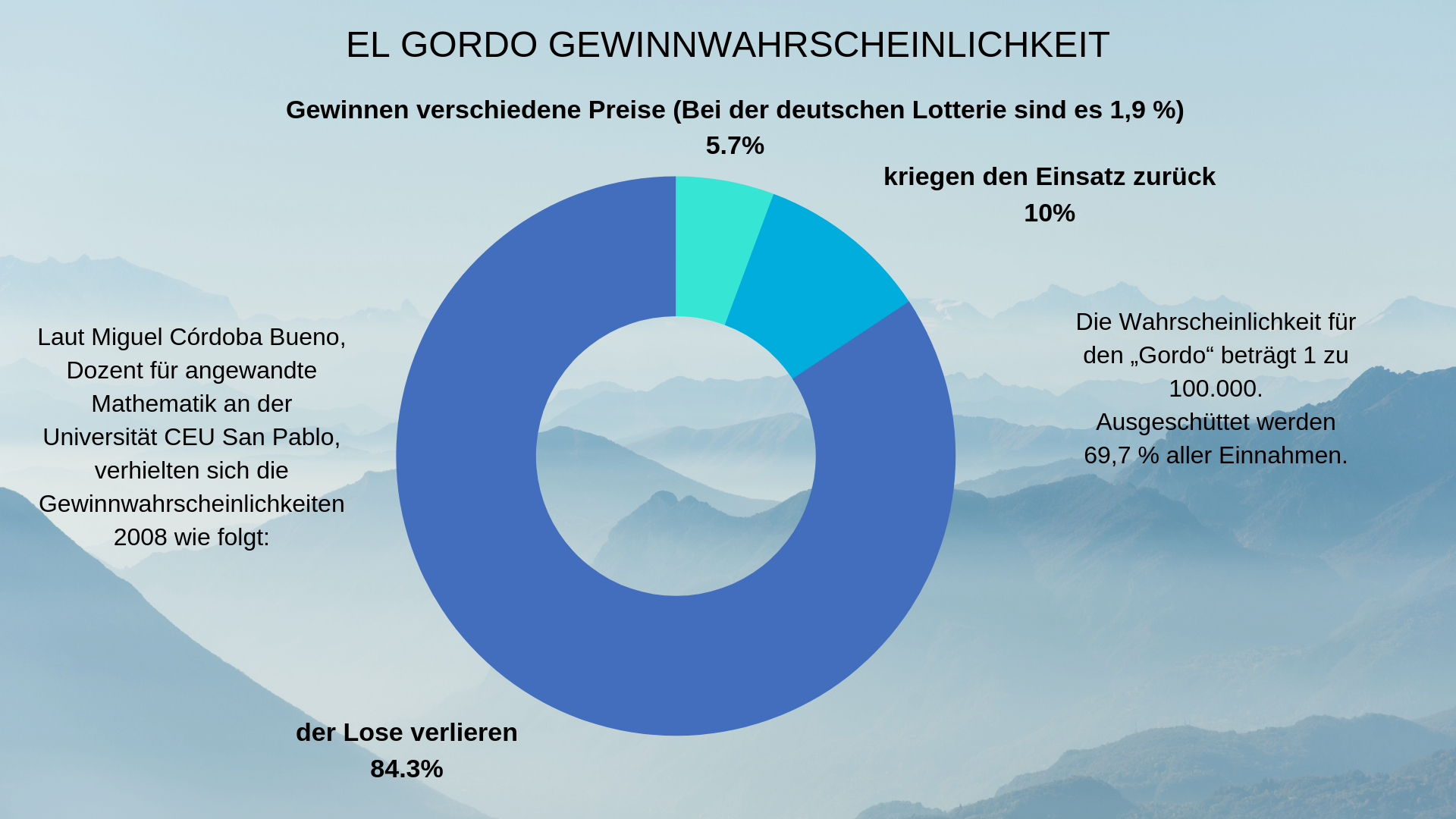Der weitere Grund warum die Weihnachtslotterie so beliebt ist, sind die hohen Gewinnchancen. Der Hauptpreis ist zwar kleiner als bei großen Lotterien wie EuroMillionen, aber dafür ist die Chance auf den Jackpot zu gewinnen sehr viel größer. In Zahlen ausgedrückt bedeutet das, dass die Wahrscheinlichkeit den Jackpot bei Lotto 6aus 49 zu gewinnen bei 1 zu 139.838.160 liegt, die Chance den El Gordo („der Dicke“) zu gewinnen, ist im Vergleich bei nur 1 zu 100.000. Wenn man diese beiden Wahrscheinlichkeiten im Vergleich sieht, ist es leicht zu verstehen, warum so viele spanier bei der Weihnachtslotterie mitspielen.
